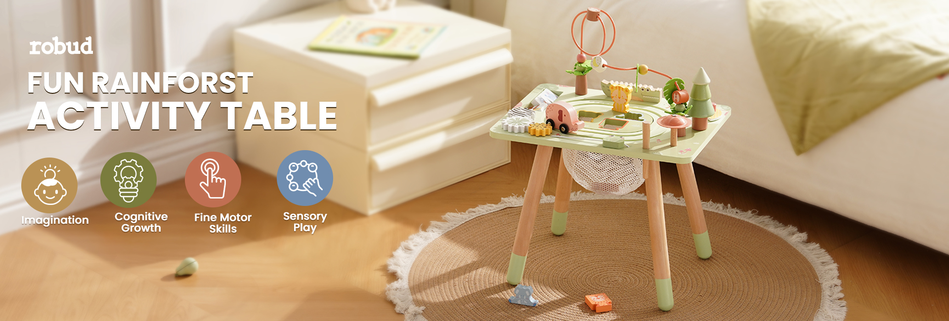 Segura y Duradera: Hecha de madera de alta calidad con bordes suaves y redondeados, esta mesa de actividades para niños es lo suficientemente duradera para el juego diario. La construcción robusta asegura estabilidad, y los materiales no tóxicos y seguros para niños brindan tranquilidad a los padres.