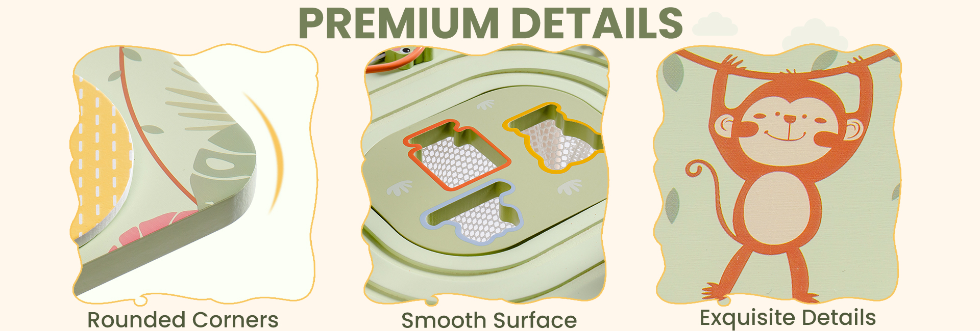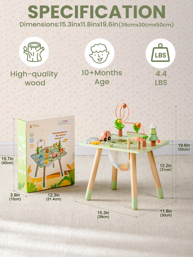 Diseño Montessori: Esta mesa de actividades, adecuada para niños de 1 a 3 años, fomenta el aprendizaje práctico y el juego interactivo. Actividades como la clasificación de formas y las Cuentas de Selva Tropical mejoran las habilidades motoras finas y la coordinación mano-ojo, fomentando la resolución de problemas y el desarrollo cognitivo.