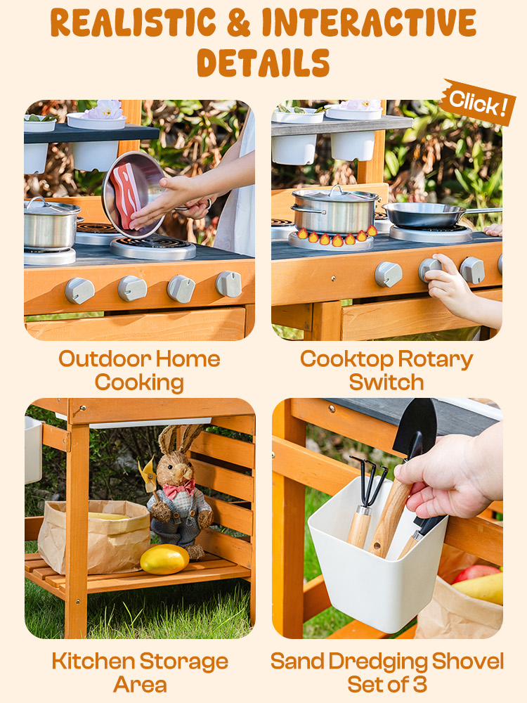 - Almacenamiento inteligente y limpieza fácil: ¡Mantén todo organizado con la práctica estantería de almacenamiento! Esta cocina al aire libre para niños ofrece un amplio espacio para guardar ollas, herramientas y accesorios de juego sucios. La superficie lisa se limpia fácilmente con agua, por lo que el juego de cocina para niños siempre está listo para la próxima sesión creativa—sin complicaciones, sin desorden.