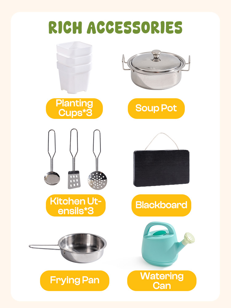 - 【Desarrolla la Imaginación y Habilidades Sociales】Nuestra Cocina de Barro para Niños al Aire Libre incluye una pizarra de doble cara para la planificación del menú. Y el diseño de cocina realista anima a los niños a participar en juegos de roles. Así, nuestra Cocina para Niños al Aire Libre estimula naturalmente la imaginación y promueve la cooperación en equipo, transformando el tiempo de juego en valiosas experiencias de aprendizaje social.