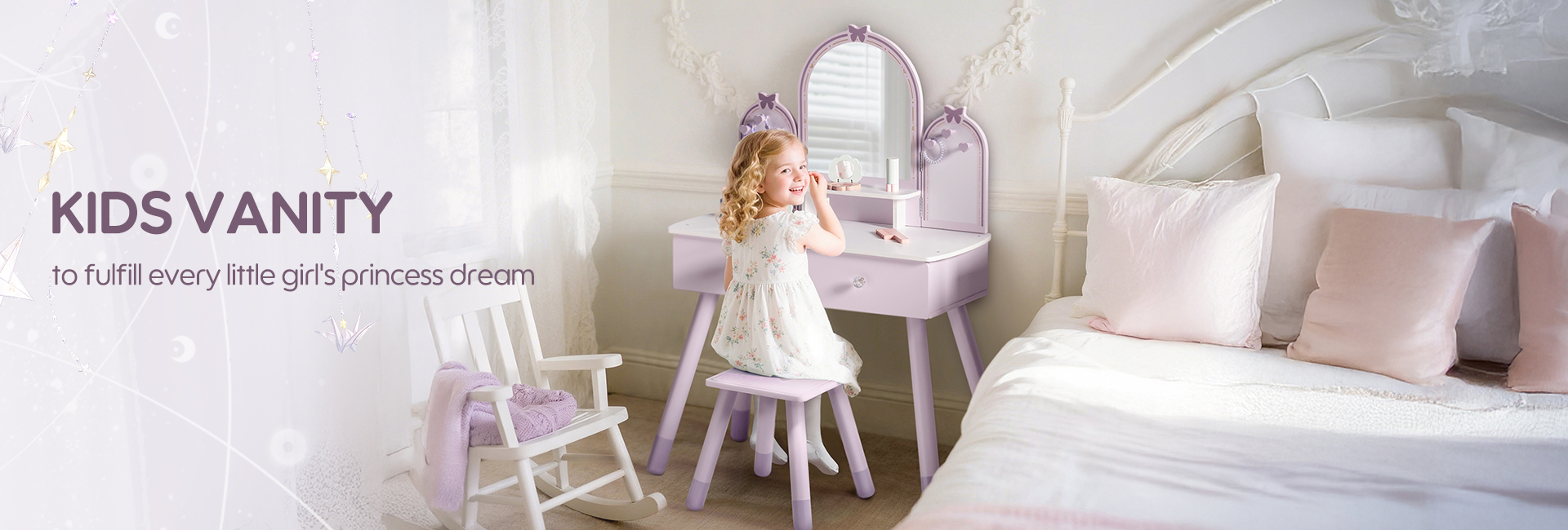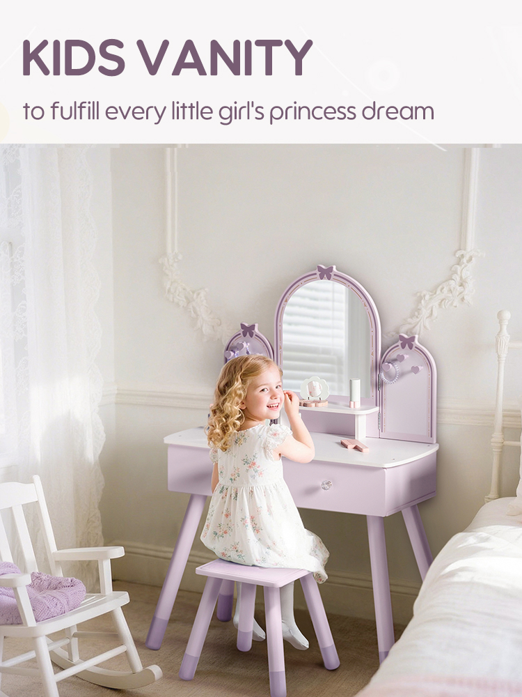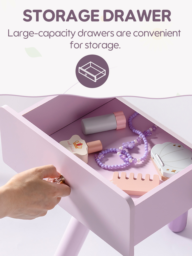 【Diseño Encantador】Nuestro tocador es tanto funcional como hermoso. La colisión de púrpura claro y púrpura oscuro crea una atmósfera maravillosa, que es perfecta para inspirar la imaginación de los niños.