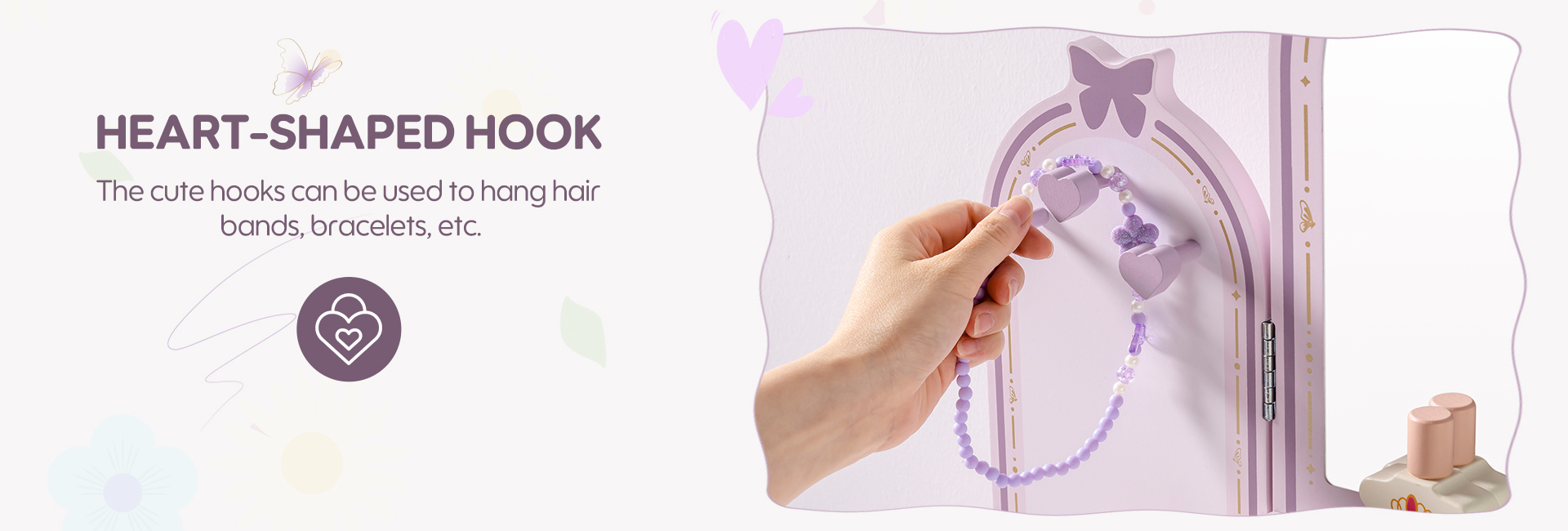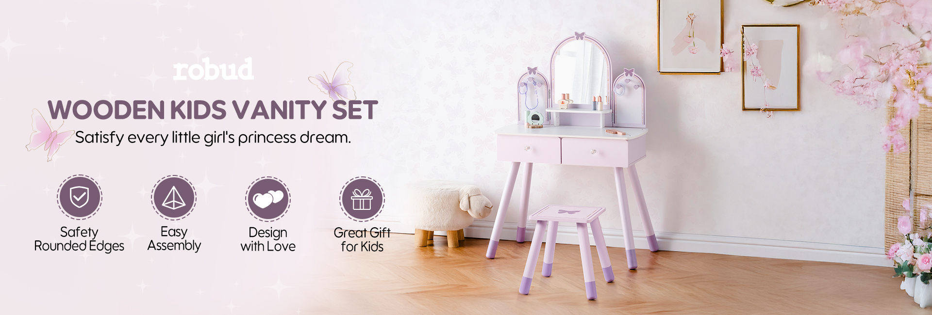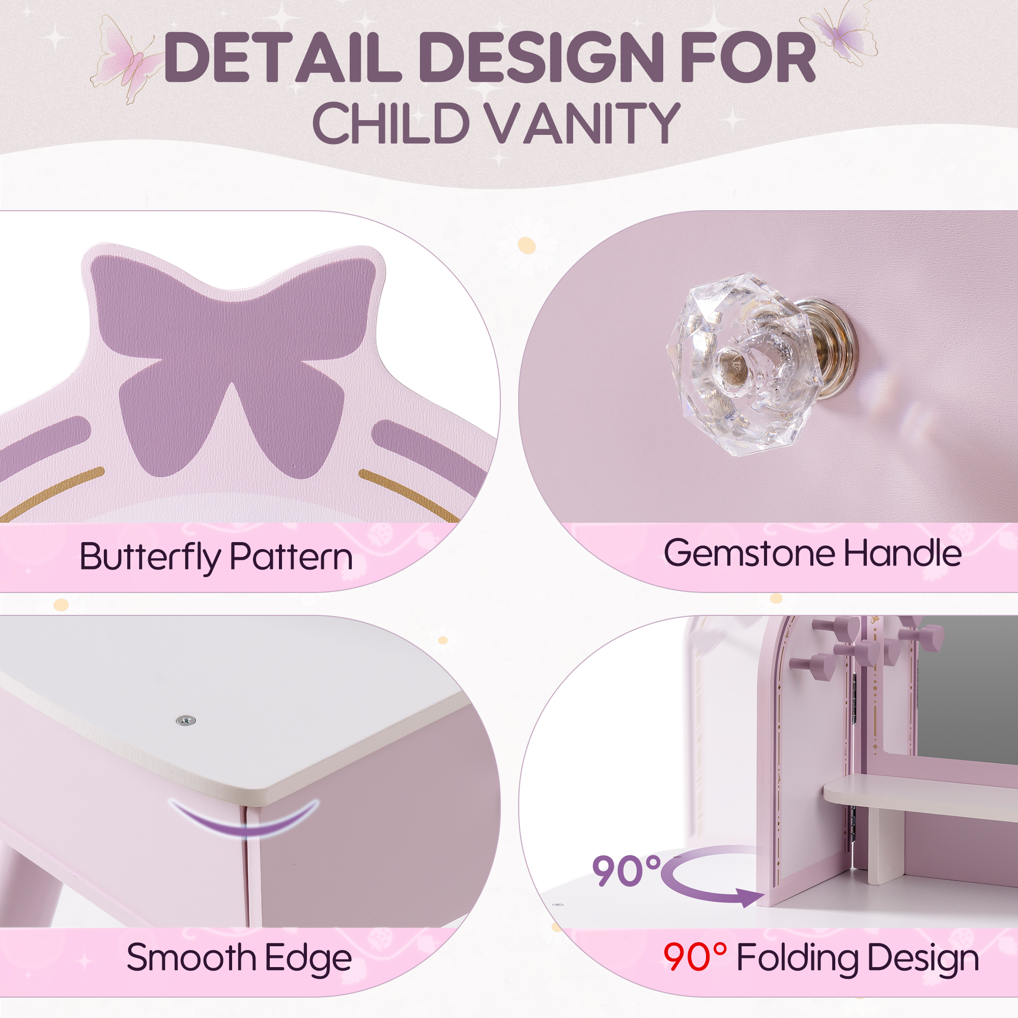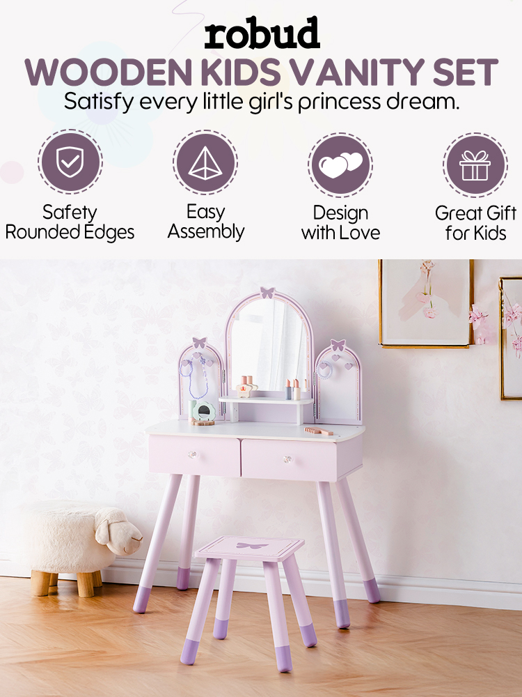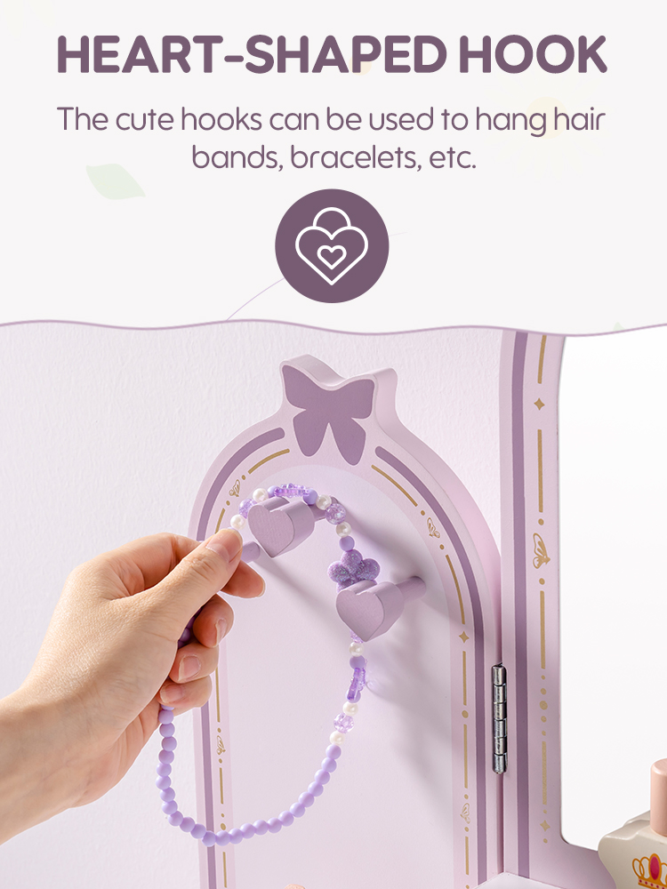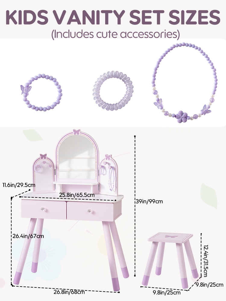 【Conjunto de Tocador Mariposa】Este conjunto de tocador mariposa es fácil de ensamblar, con pequeños cajones y espejos removibles y un pequeño banco de madera para crear una versión mini realista de un tocador de tamaño completo. Los niños pueden divertirse jugando con él.