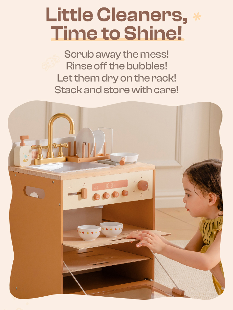 Multifuncional: Este lavavajillas se centra en la limpieza, el almacenamiento y el ajuste, y está equipado con perillas de efectos de sonido realistas, lo que permite a los niños experimentar la verdadera diversión en el proceso de limpieza simulado. La combinación de múltiples funciones enriquece la experiencia de juego y estimula la creatividad de los niños.