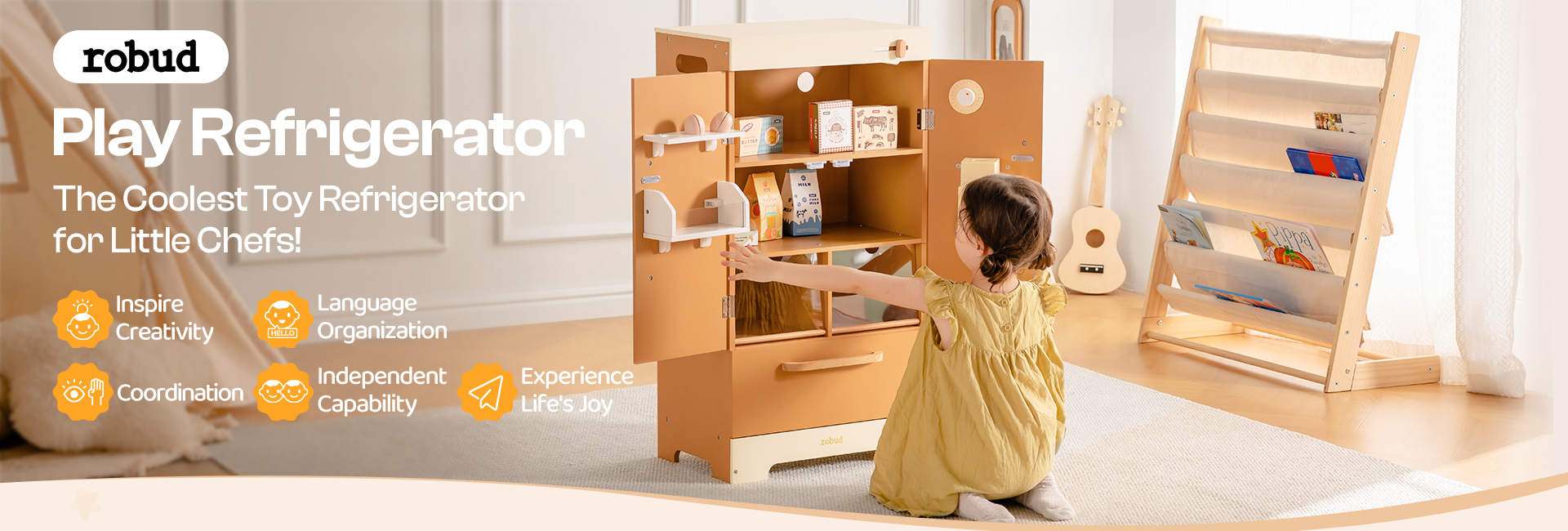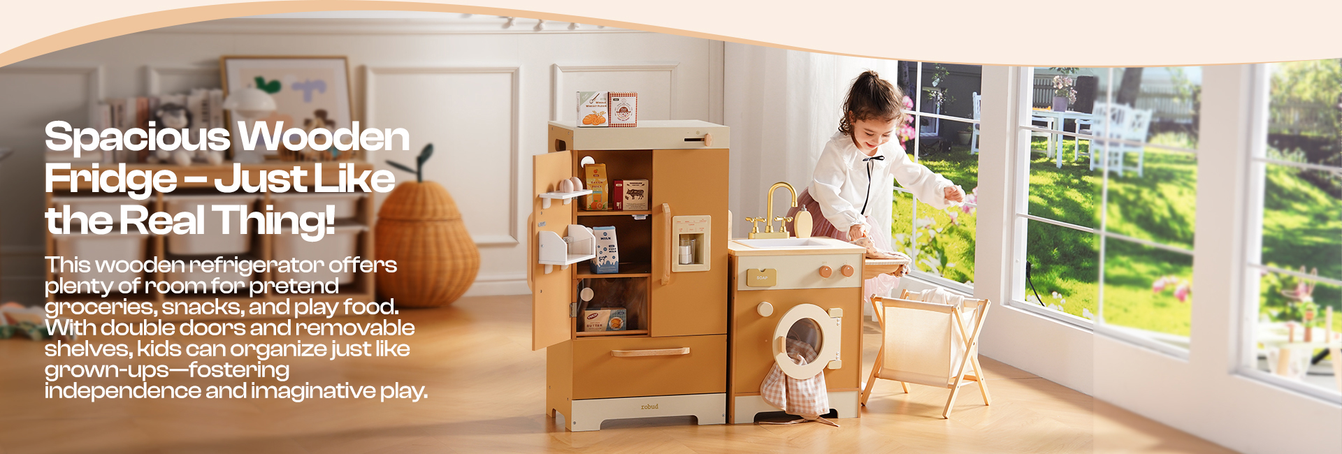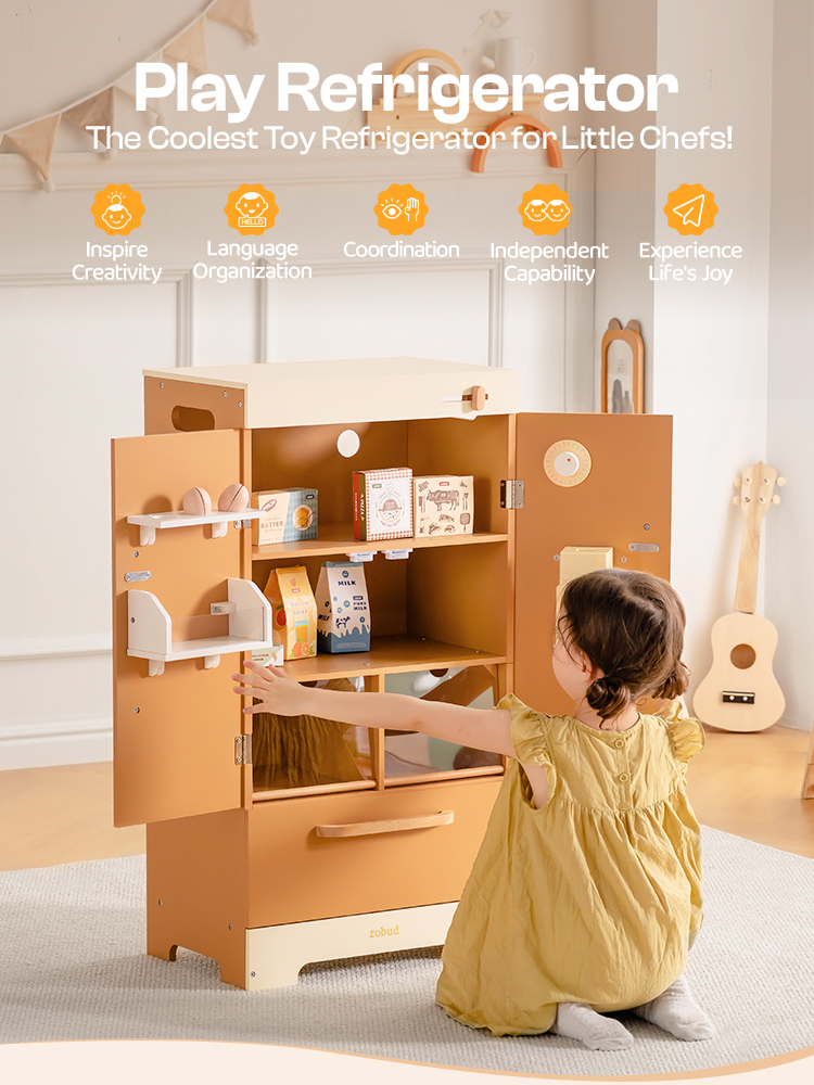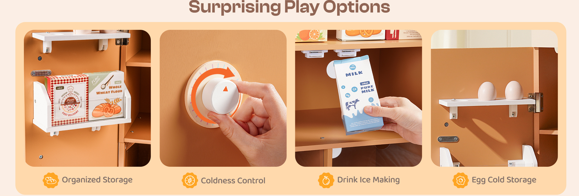 Perilla de Temperatura Ajustable: El refrigerador incluye una divertida perilla de temperatura ajustable que permite a los niños pretender controlar la temperatura del refrigerador, mejorando su experiencia de juego de roles y comprensión de los electrodomésticos del mundo real.
