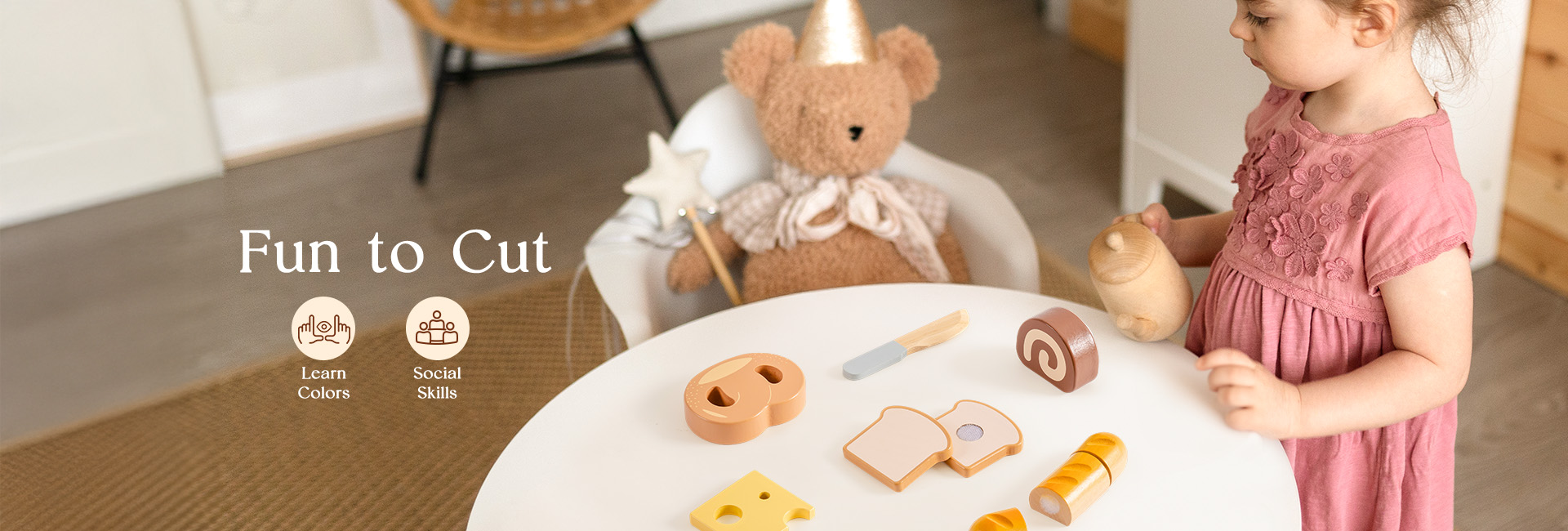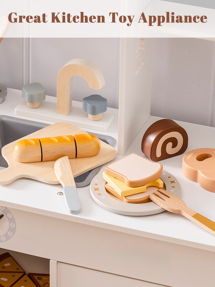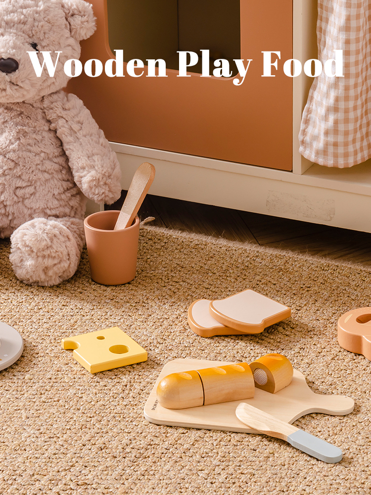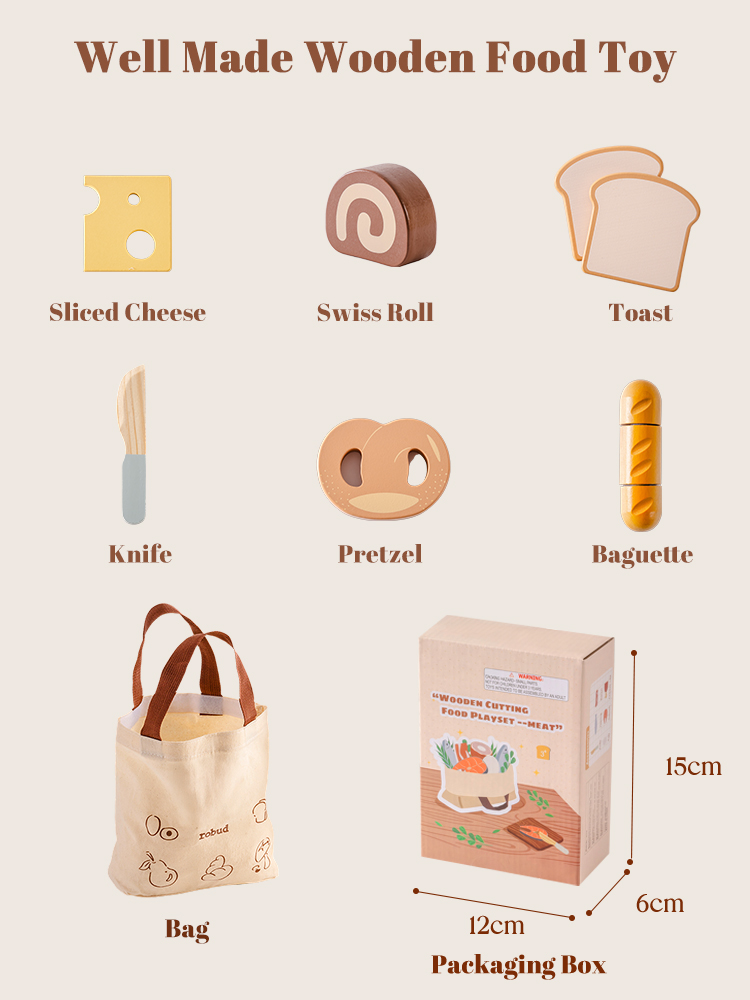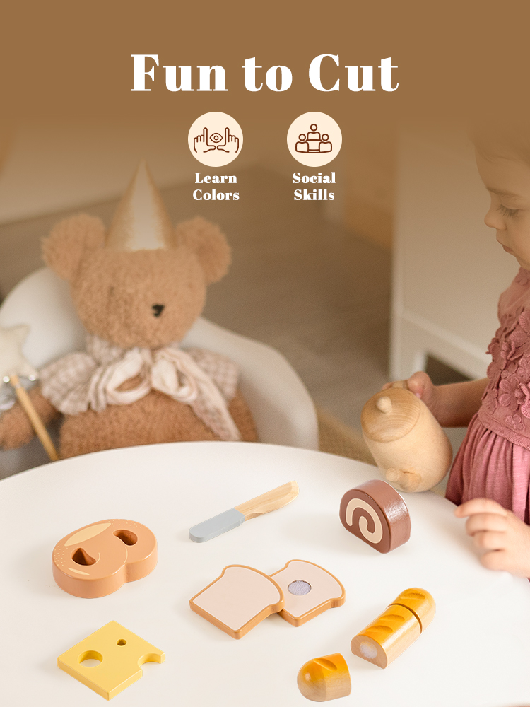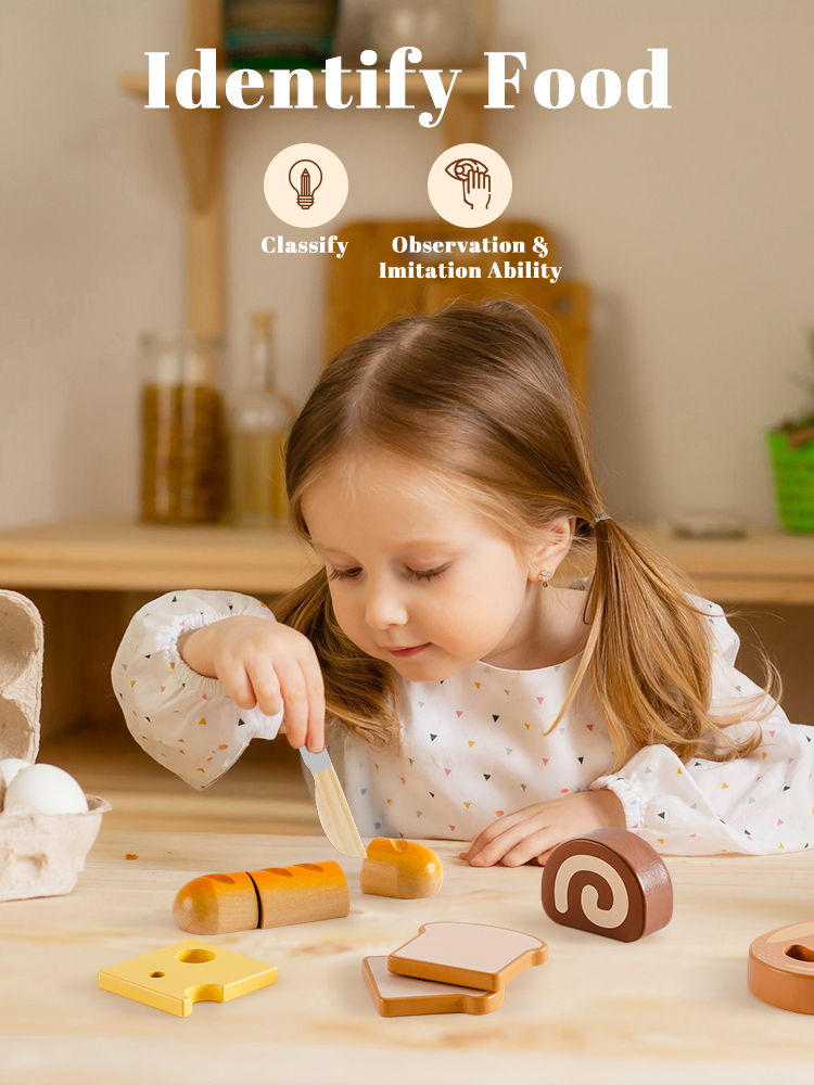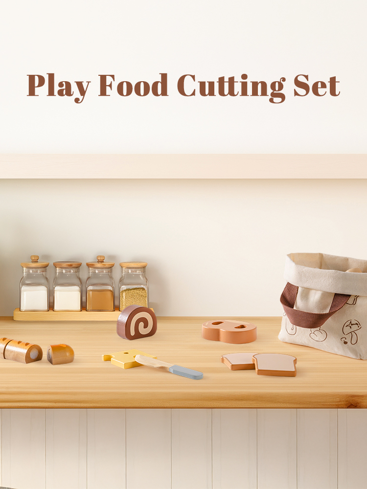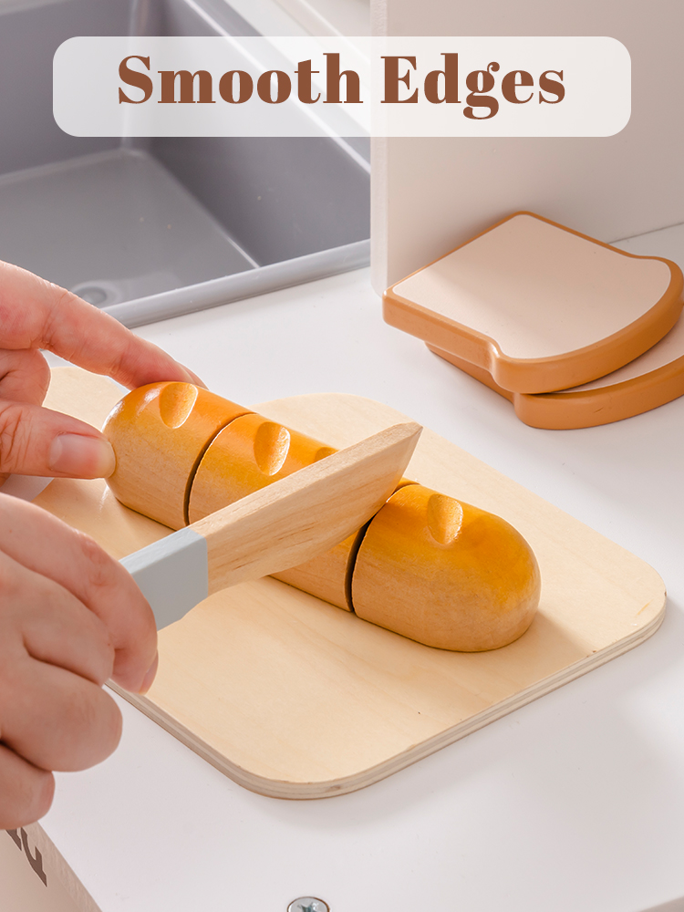 CONSTRUIDO PARA MANOS PEQUEÑAS: Cada pieza de este set de juguetes de comida de madera está hecha de madera de alta calidad y duradera, con bordes suaves y un acabado no tóxico. El cuchillo de madera es seguro para las manos pequeñas, ayudando a los niños a desarrollar habilidades motoras finas mientras juegan y aprenden.