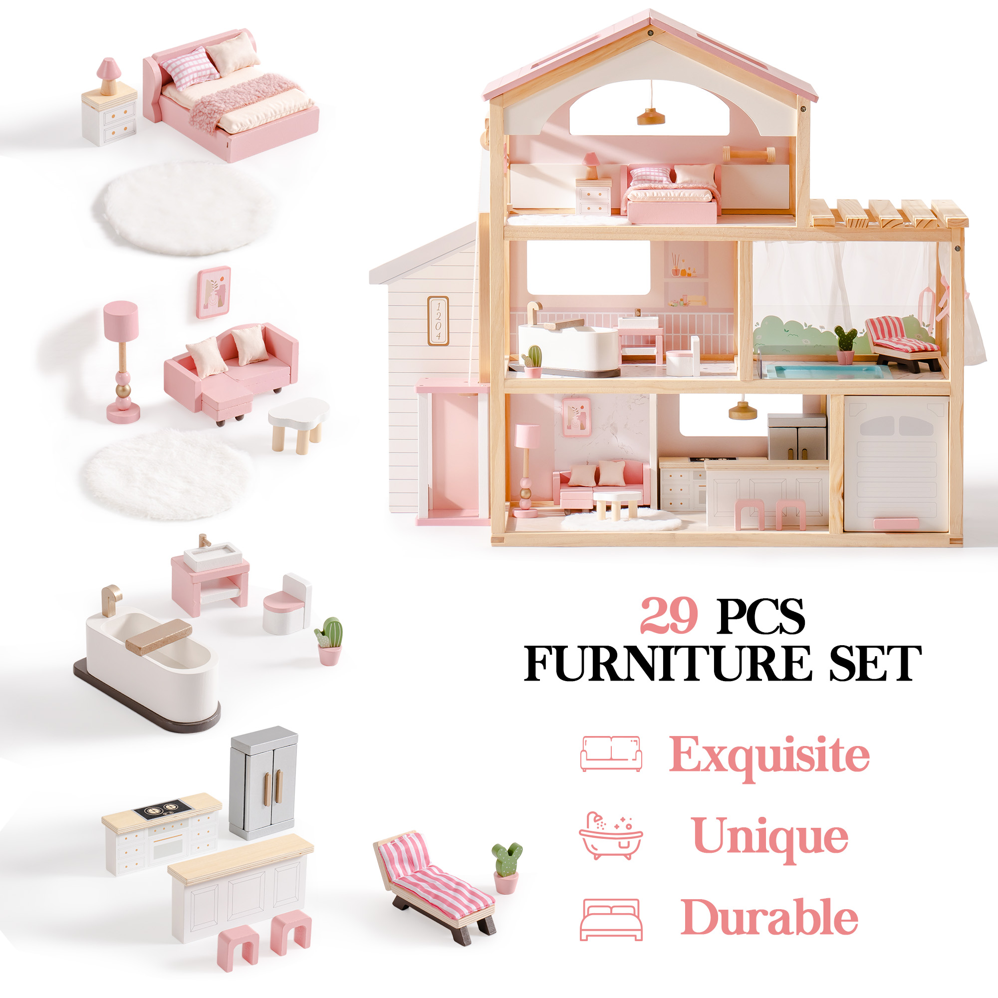 Casa de Ensueño Elegante: La Casa de Muñecas ROBUD presenta un elegante techo rosa y una estructura de madera natural, combinando elementos arquitectónicos modernos con detalles realistas para mostrar el encanto de los espacios de vida contemporáneos, dedicada a proporcionar a los niños una experiencia de juego caprichosa.