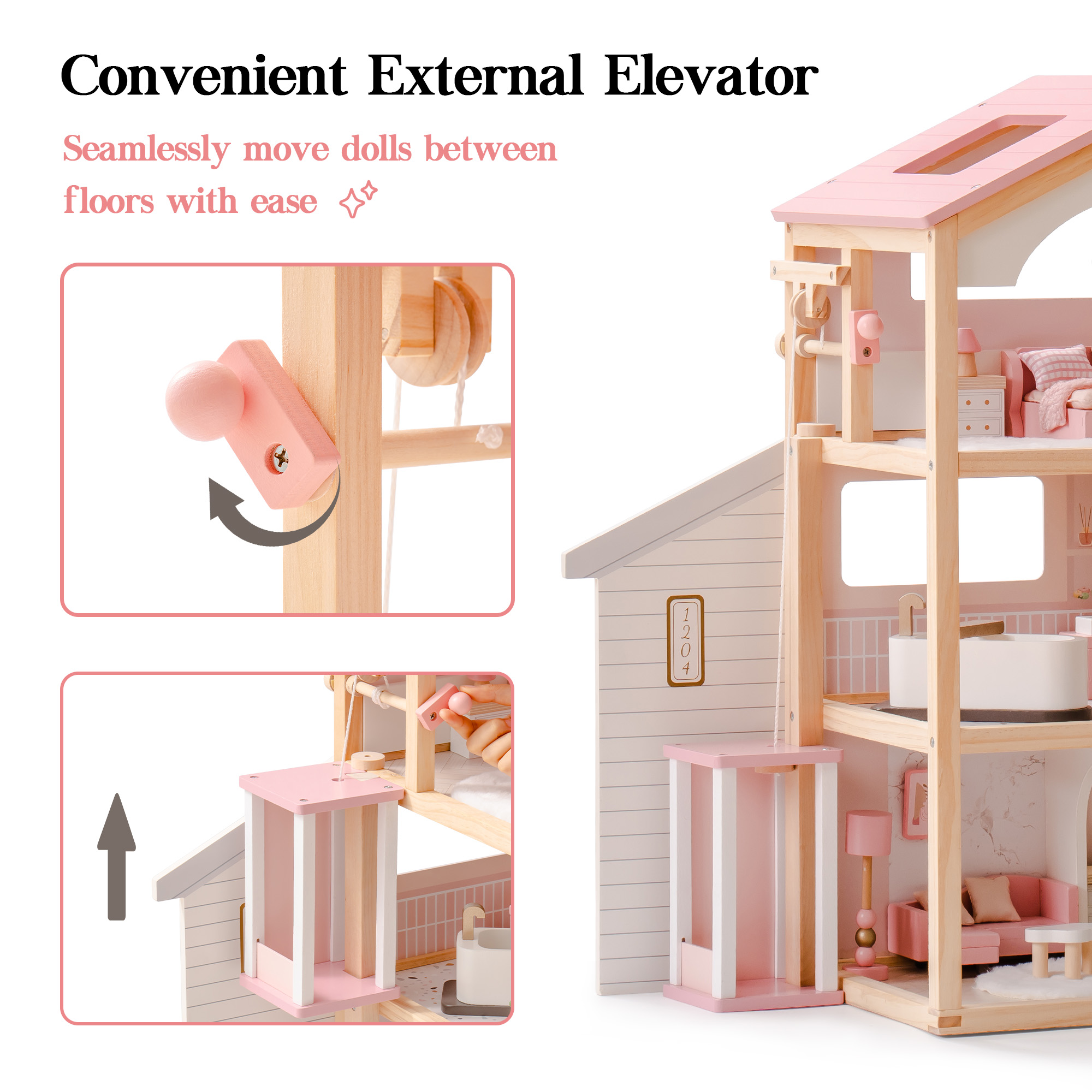 Maravilla de Tres Niveles: La casa de muñecas cuenta con un ascensor funcional y un diseño de tres niveles con seis habitaciones, incluyendo un dormitorio elegante y acogedor, un adorable baño, una cómoda piscina, una exquisita sala de estar, una cocina abierta y un garaje. Este conjunto integral abarca varios aspectos de la vida diaria, recreando escenas de vida real. A través del juego, enciende la imaginación infinita de los niños y la curiosidad por la exploración.