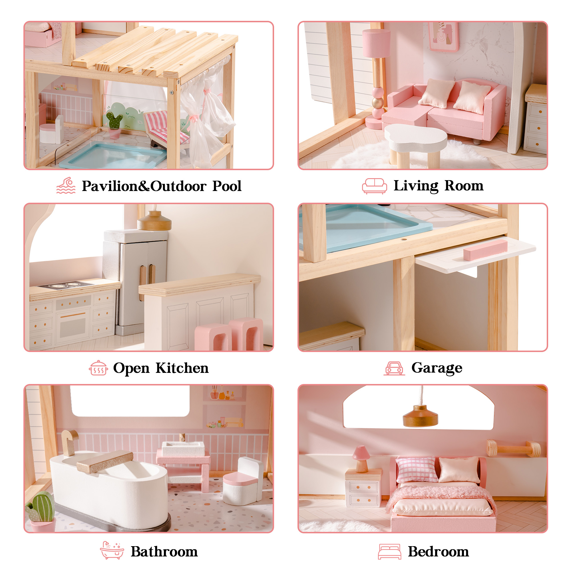 Diseño Único: El elegante diseño de la piscina añade un toque de lujo a la casa de muñecas, mientras que las cortinas fluidas junto a la piscina crean un espacio relajante para que las muñecas disfruten. El diseño único del garaje mejora la funcionalidad de la casa de muñecas, añadiendo más diversión e interacción a las aventuras de juego de roles.