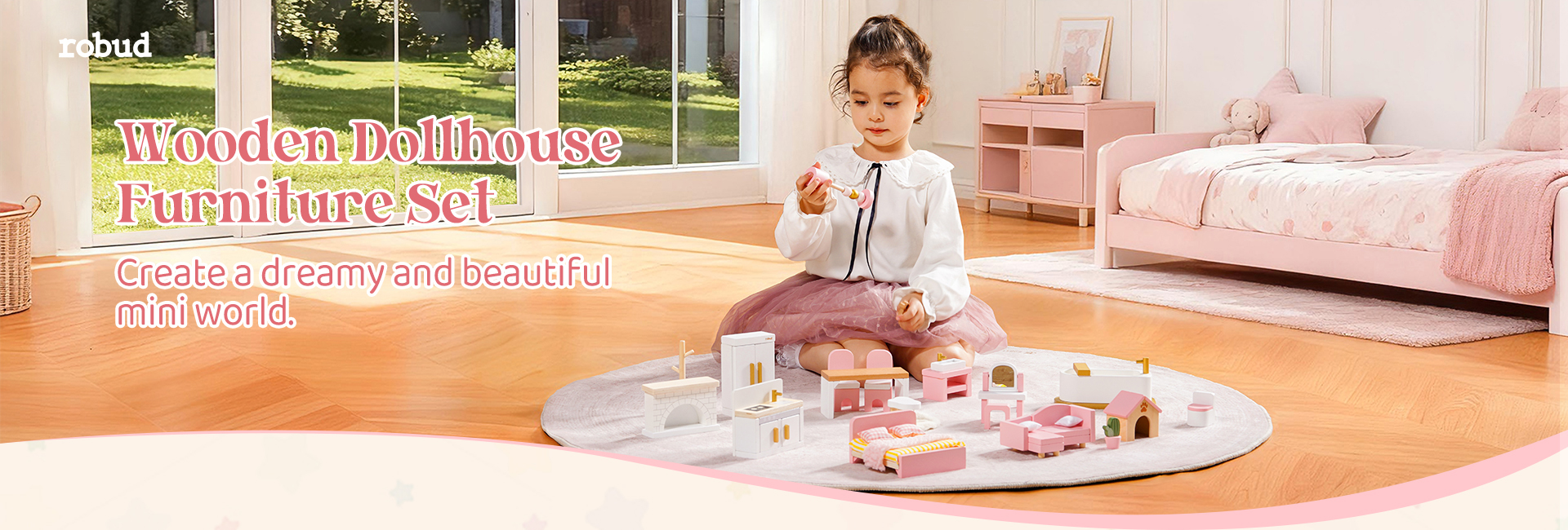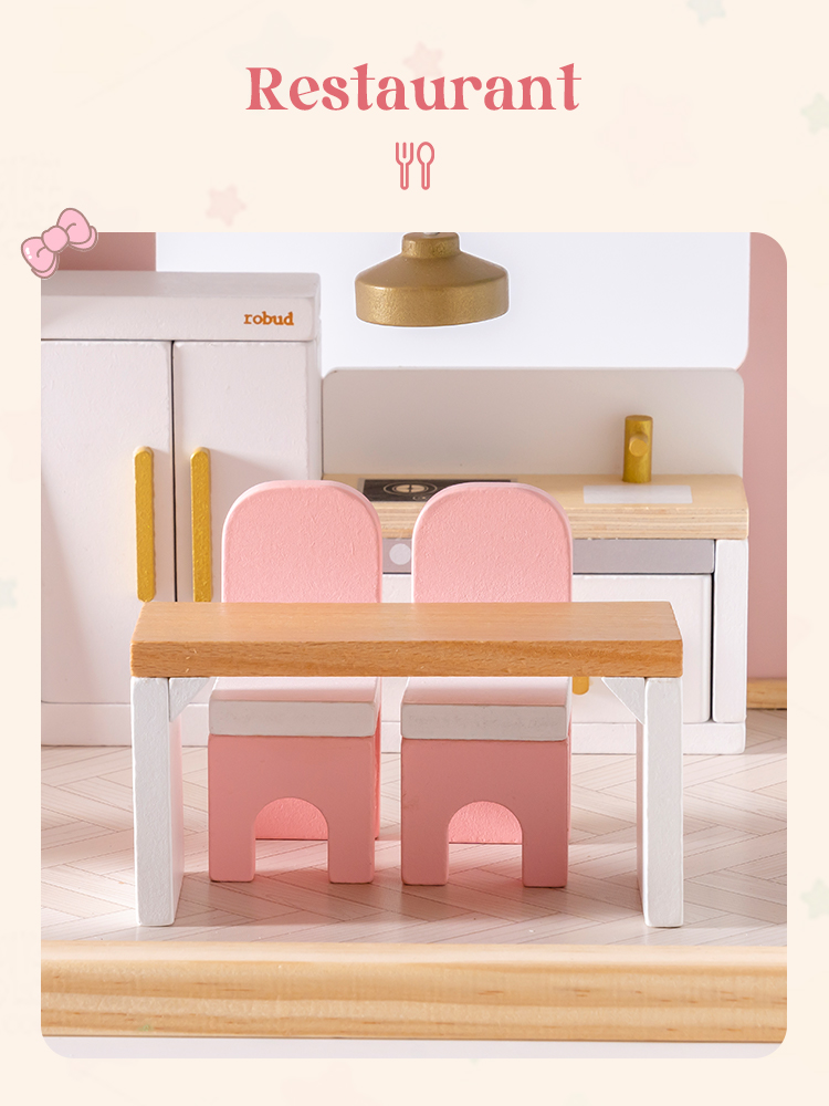 MUEBLES DE CASA DE MUÑECAS DE ALTA CALIDAD: El conjunto de muebles en miniatura ROBUD incluye una sala de estar, dormitorio, baño, cocina y comedor. Meticulosamente elaborado con materiales de alta calidad, se erige como un guardián de la inocencia infantil.