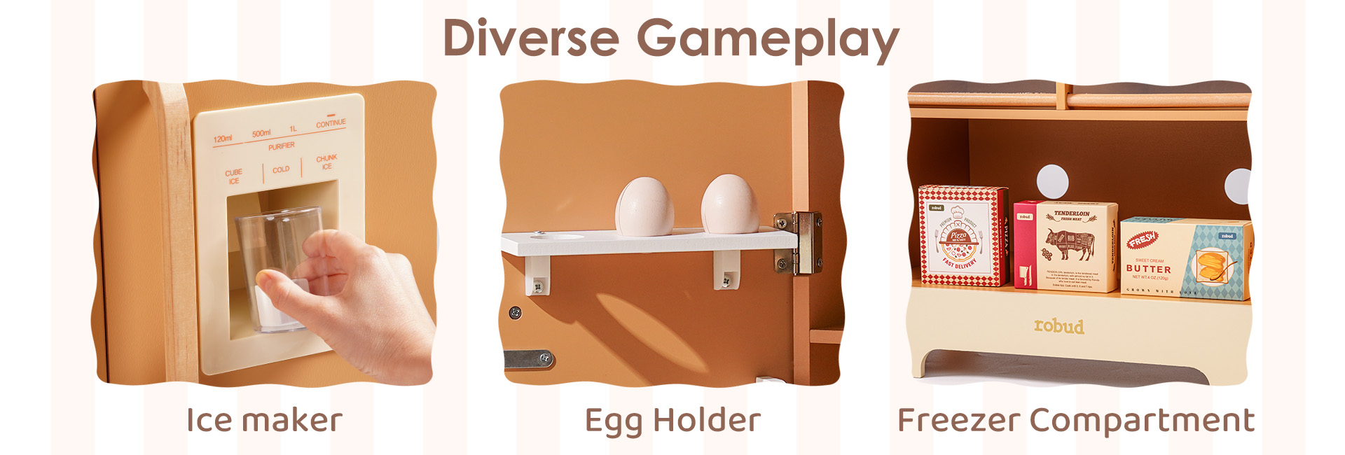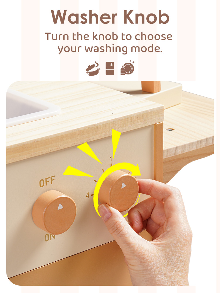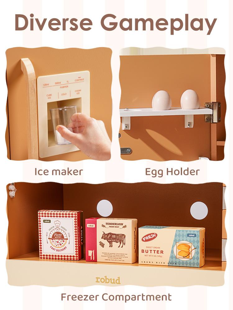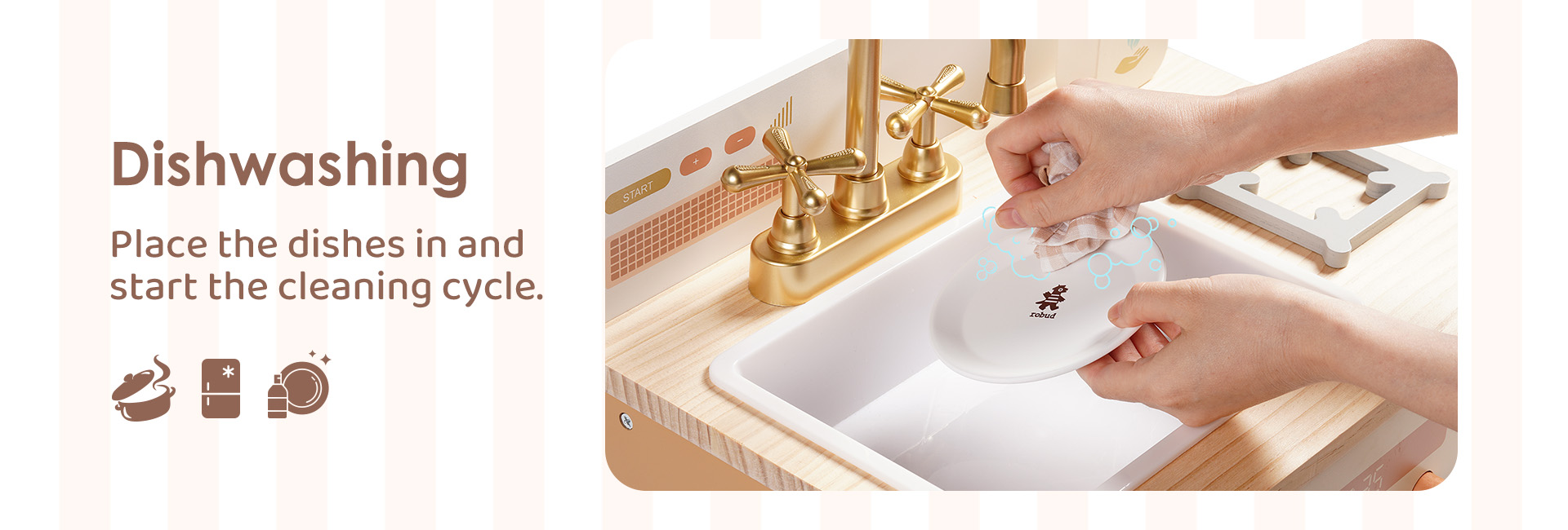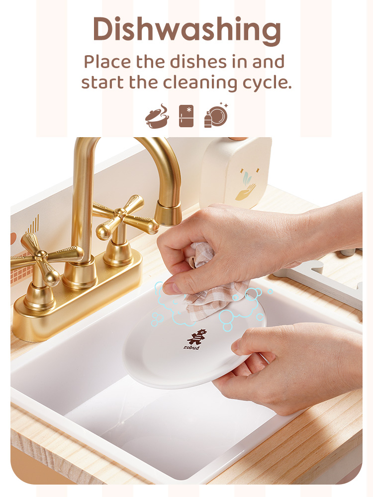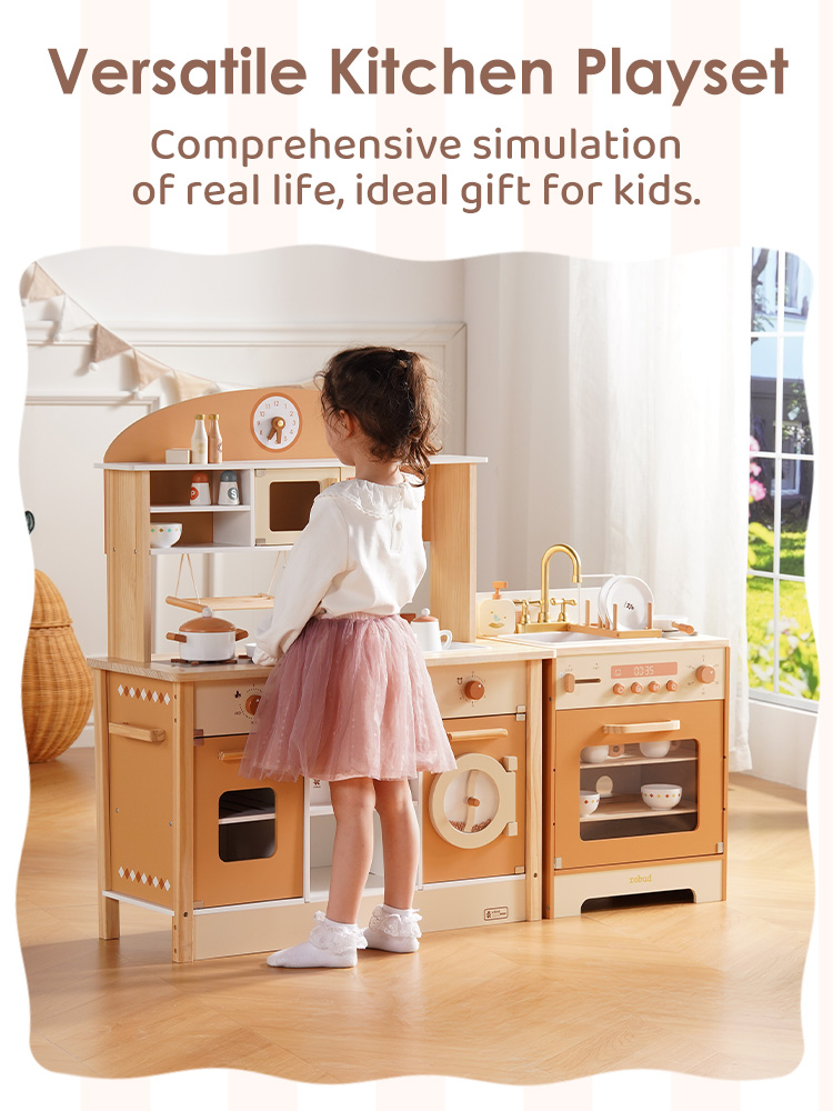 👪COCINA ESQUINERA INTEGRADA: El conjunto de cocina de juego ROBUD Deluxe incluye una cocina de juguete, lavavajillas, refrigerador y lavadora, cada uno meticulosamente diseñado para proporcionar a los niños una experiencia de juego integral y despertar su pasión por la vida.