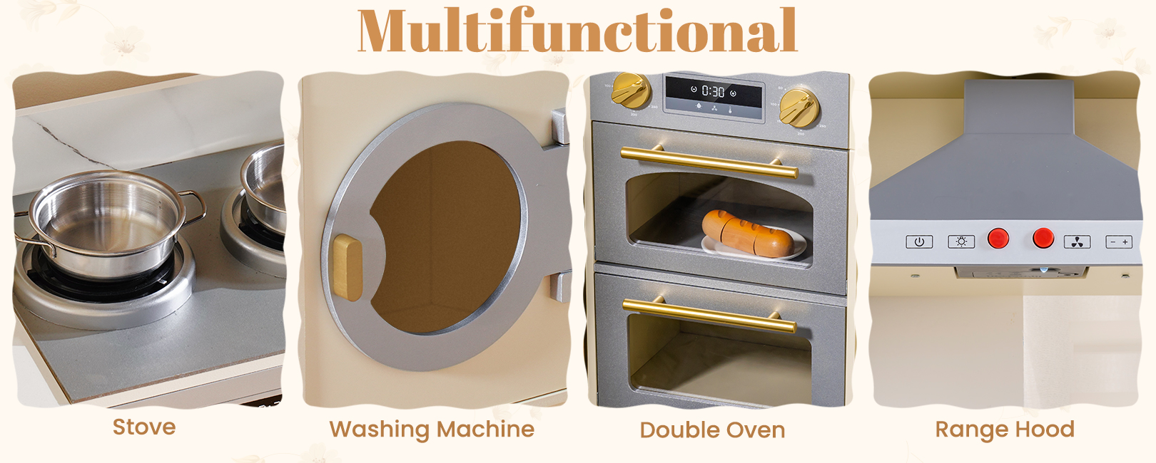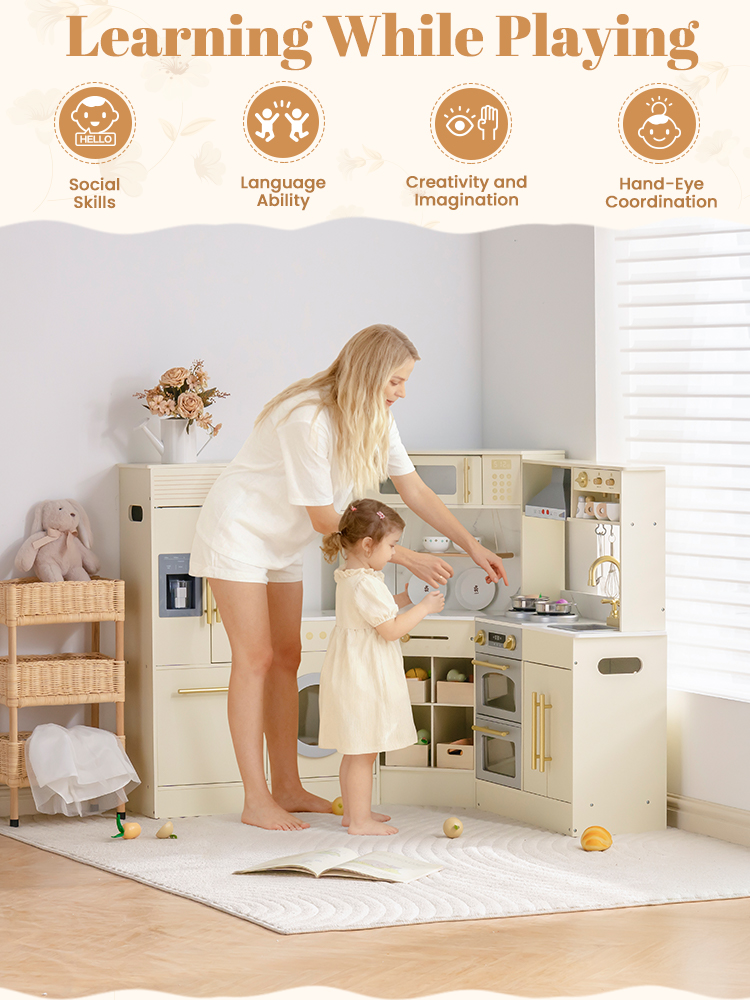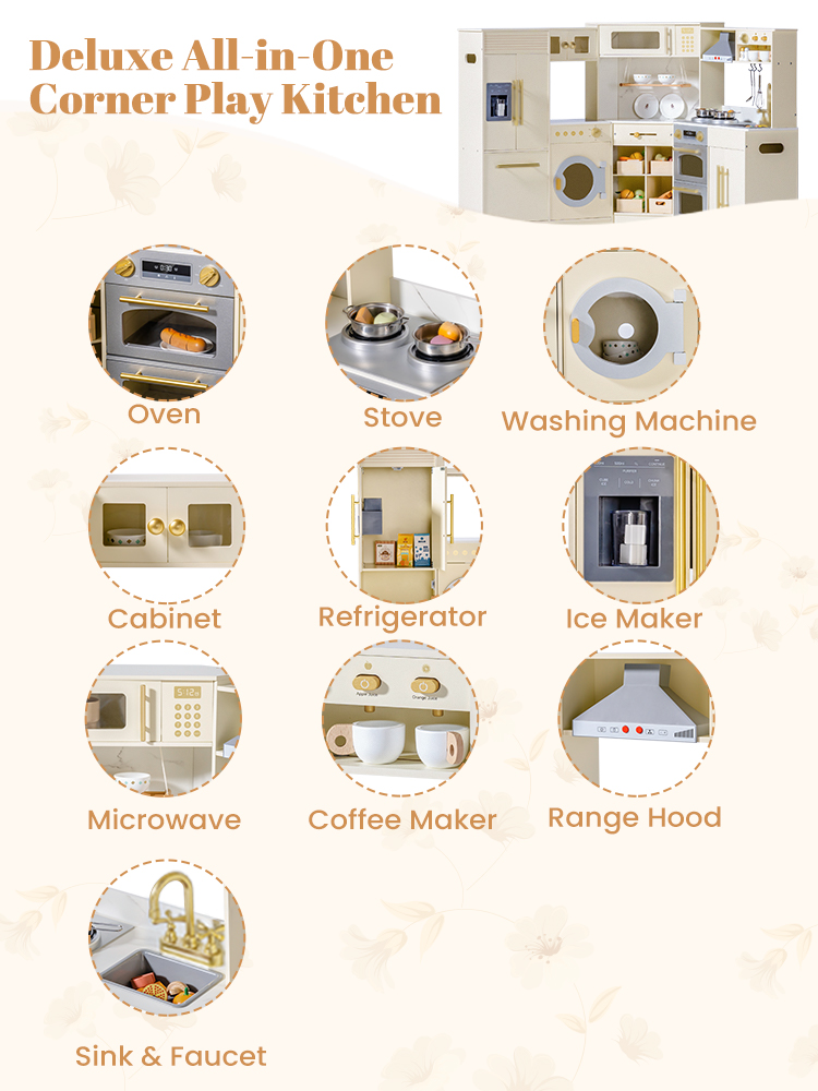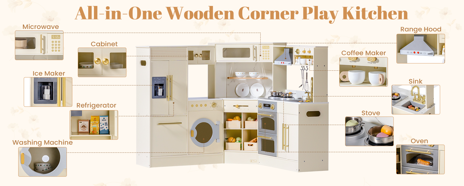 - JUEGO DE COCINA DE MADERA TODO EN UNO: Esta lujosa cocina de esquina combina un refrigerador, un horno, un juego de lavandería y un armario de almacenamiento, fabricados con madera resistente. Es el centro de juego de simulación perfecto para niños de 3 años en adelante, ofreciendo una experiencia de cocina realista a través de múltiples zonas funcionales.