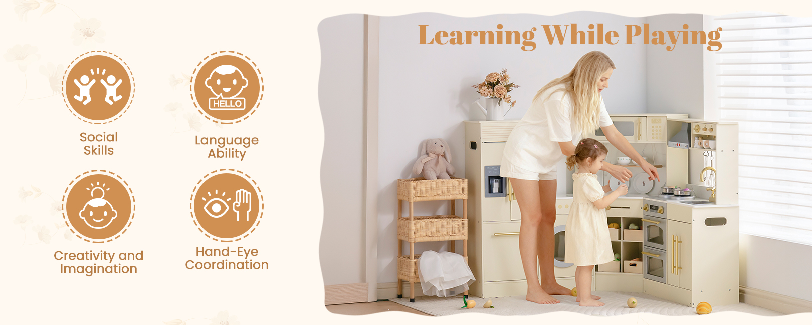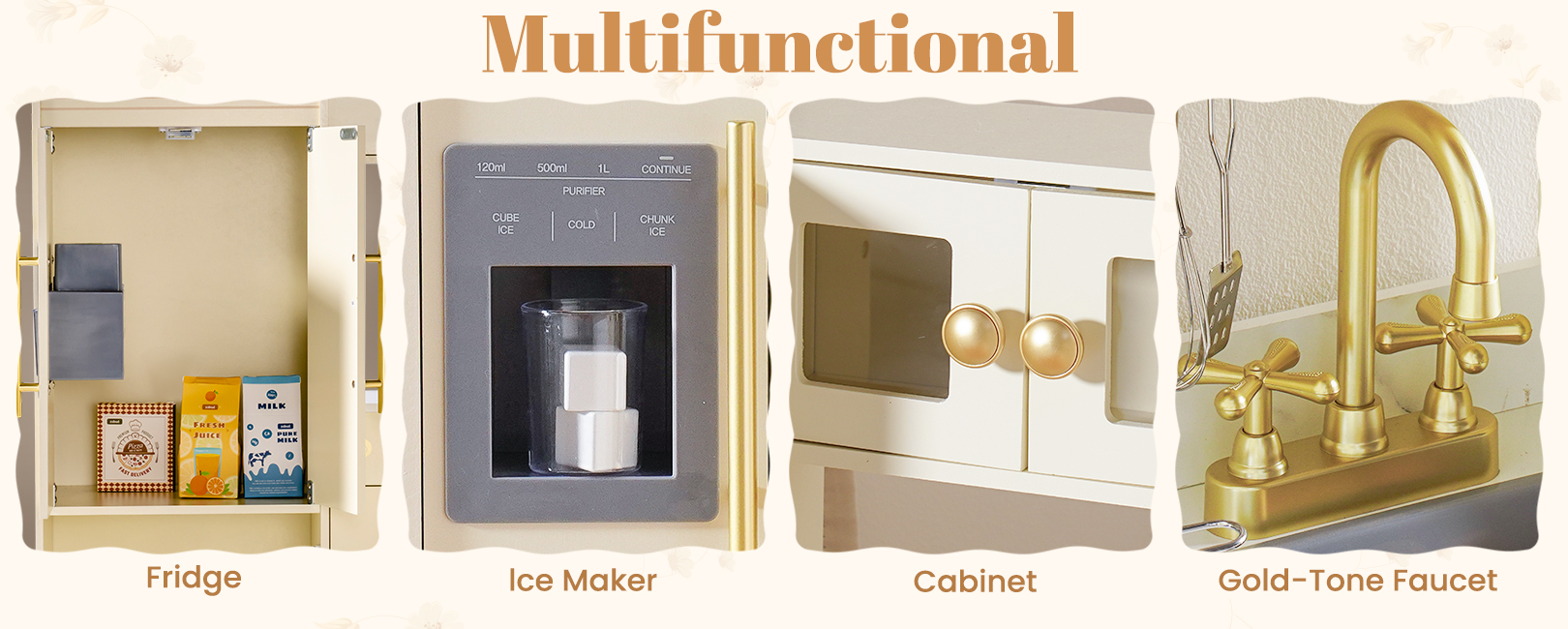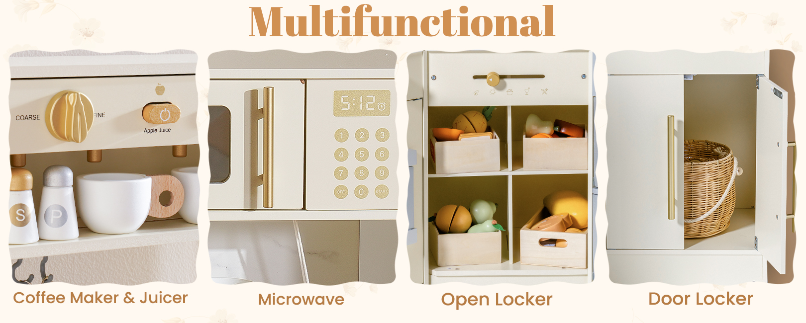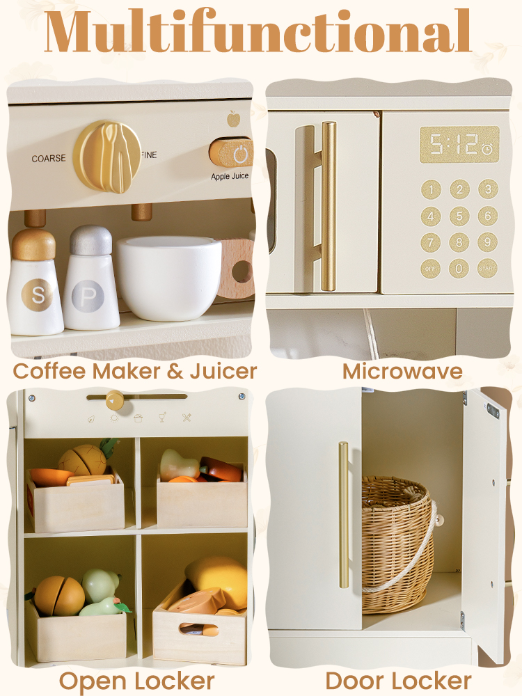 - JUEGO DE COCINA DE MADERA TODO EN UNO: Esta lujosa cocina de esquina combina un refrigerador, un horno, un juego de lavandería y un armario de almacenamiento, fabricados con madera resistente. Es el centro de juego de simulación perfecto para niños de 3 años en adelante, ofreciendo una experiencia de cocina realista a través de múltiples zonas funcionales.