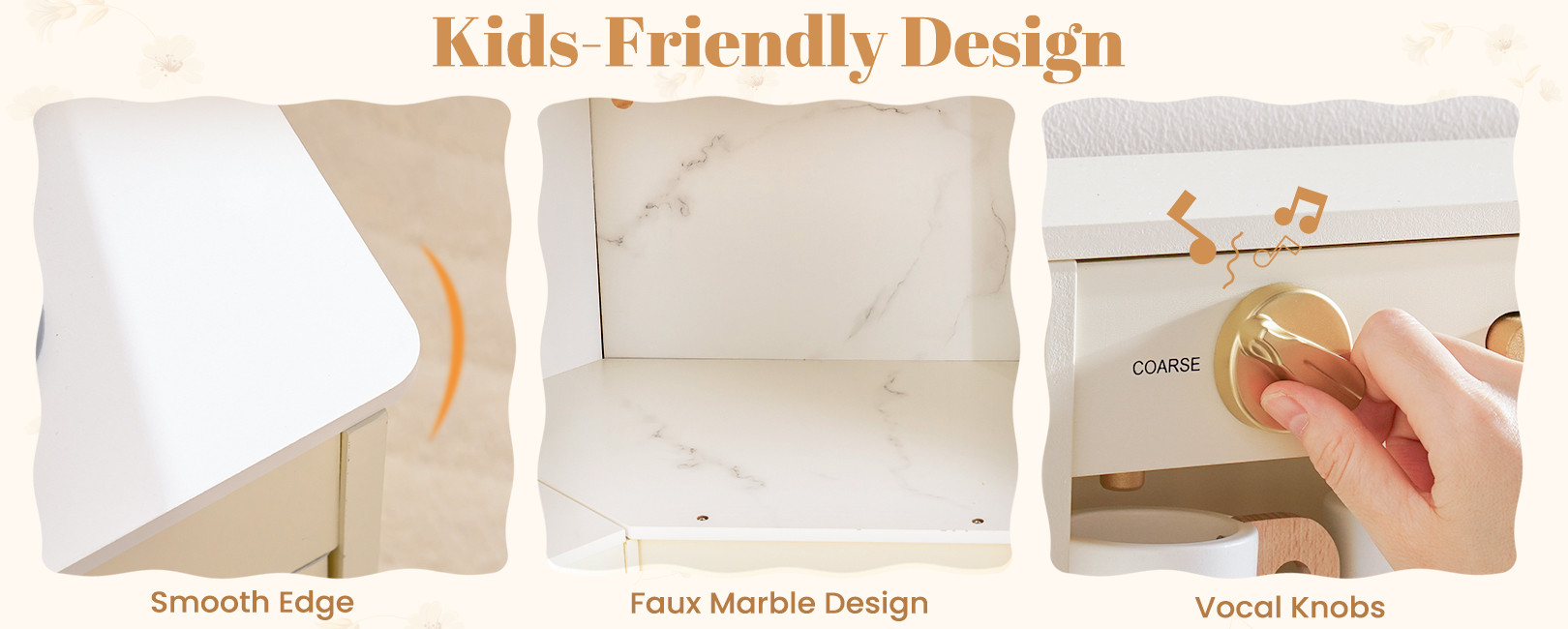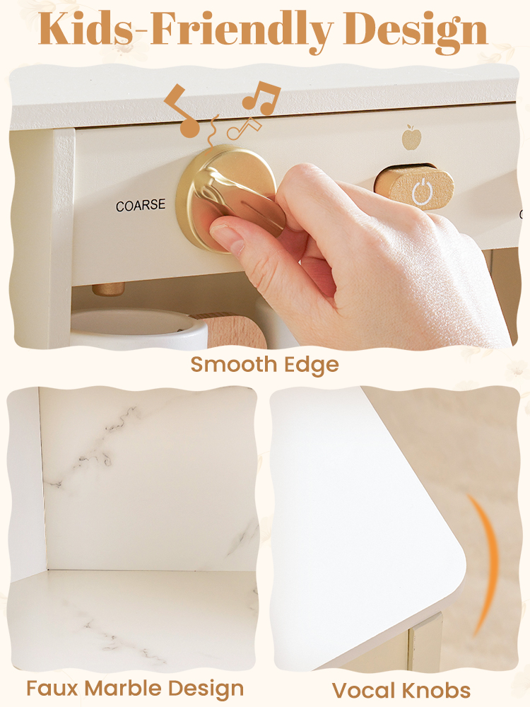 - DISEÑO AMIGABLE PARA NIÑOS Y MATERIALES SEGUROS: Con bordes suaves, perillas de fácil agarre y una construcción de madera duradera, este juego de cocina para niños está diseñado para manos pequeñas. Soporta de manera segura el juego activo, resistiendo horas de aventuras culinarias imaginativas.