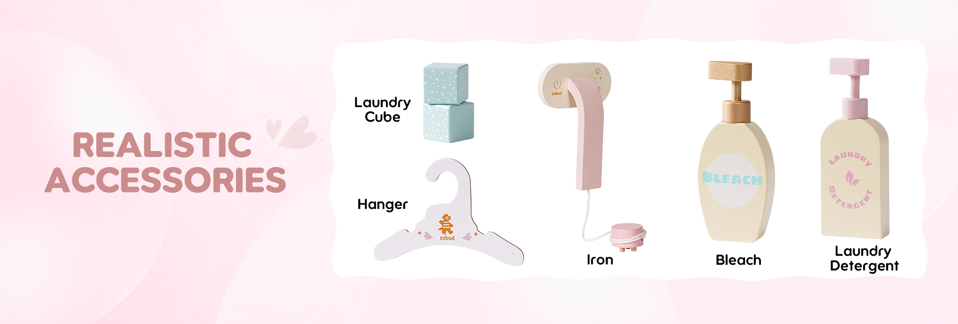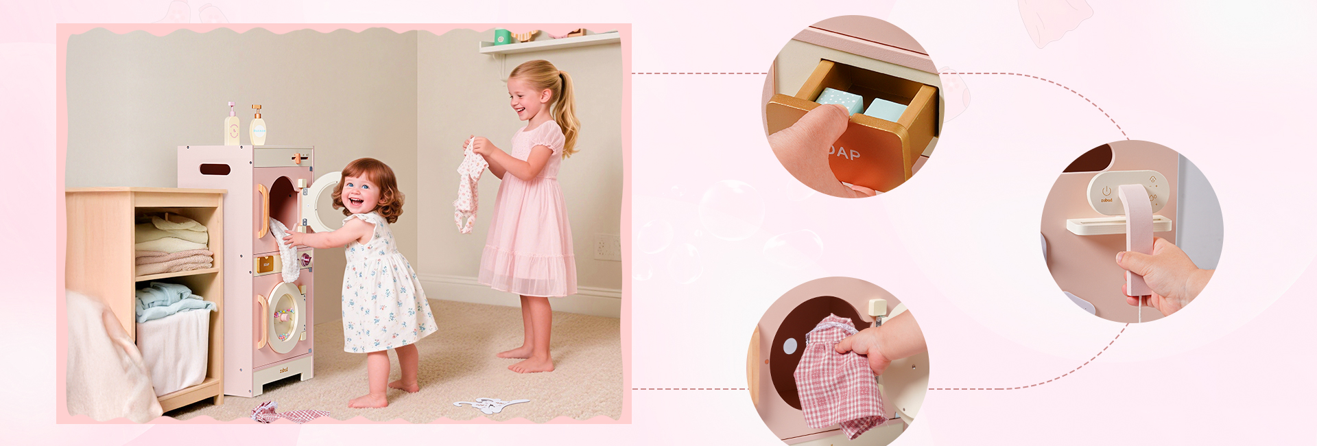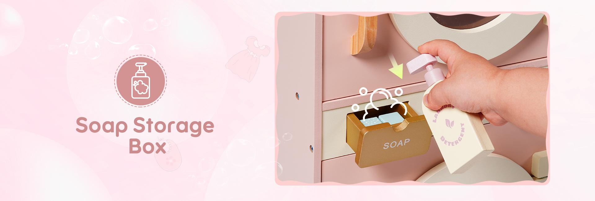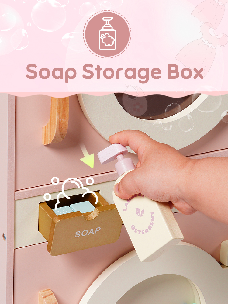🌊Ricos Accesorios: Esta lavadora está equipada con una variedad de accesorios para mejorar la experiencia de juego de los niños. Contiene detergente para ropa, blanqueador, jabón y un plato para jabón. Además, también incluye una tabla de planchar, una plancha y una cesta de ropa sucia, proporcionando todos los accesorios necesarios para el lavado diario. ¡Prepárate para que tus hijos se embarquen en una aventura de juego de lavandería! (Ropa no incluida)