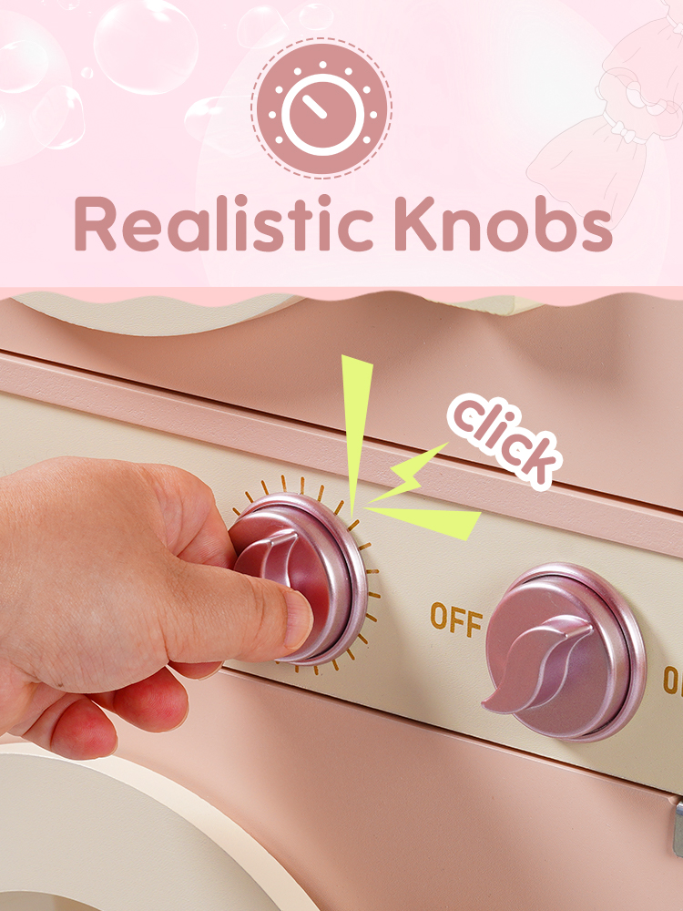 🐋Diseño Realista: Esta lavadora está diseñada con la forma de una verdadera máquina de lavar y secar. Su apariencia adorable, así como las cuentas de colores que se pueden mover manualmente en la ventana de la lavadora, simulan el movimiento de rodar de la lavadora, lo que provoca un impacto visual en los niños. Viene equipada con una cesta de ropa sucia, jabón, blanqueador y detergente para ropa para mejorar la experiencia de juego. Además, también tiene una función de planchado, lo que hace que la lavadora sea más versátil.